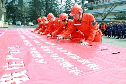 图为重庆能源渝阳煤矿党员正在印有安全誓词的横幅上签名,接受广大员工家属的监督。