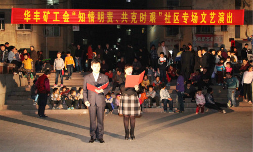 山东能源新矿集团华丰煤矿通过开展形势任务宣传教育活动进区队、进班组、进社区活动,进一步增强全矿职工的责任感和使命感,凝聚起广大职工家属关心企业发展、关注企业稳定的信心和力量。图为该矿工会举办知情明责、攻克时艰社区专场文艺演出。