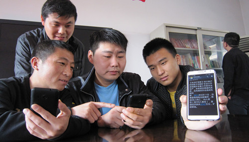 4月17日,安徽淮北矿业朱庄矿通风区几名青工正在手机上学习安全知识。今年该矿团委充分利用微信、飞信、视频、QQ等多种渠道,为团员青年转发各类安全、技术知识以及事故警示教育等内容,增强青工安全意识,牢筑安全防线。