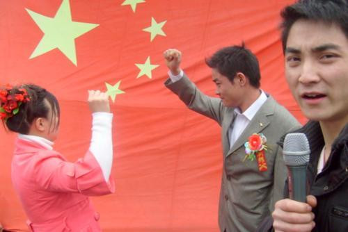 请二位面对庄严的国旗和国徽,一起宣读《结婚誓言》。520网络情人节,重庆地区风雨交加,重庆能源集团永荣公司的一对矿工情侣在婚礼上却玩出了个性。这对情侣面对国旗,紧握右拳,在工会主持人的带领下庄严宣誓,立下了做合格职工,做栋梁之材的豪情誓言。据悉,520网络情人节当日,重庆能源集团永荣公司有20多对情人去民政局登记结婚。