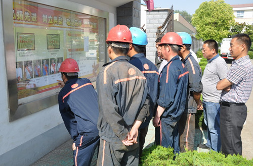 5月23日,安徽淮北矿业工程建设公司安装项目部几名职工正在观看画廊里先进人物事迹展示。