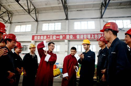 6月28日上午,皖北煤电集团恒源煤矿机修厂内,来自该矿运销部,被工友们亲切地戏称为政伟组合的许政和余道伟两人,一身长袍马褂,正有板有眼地为车间内的员工兄弟表演相声节目,不时博得大家的欢笑和掌声。