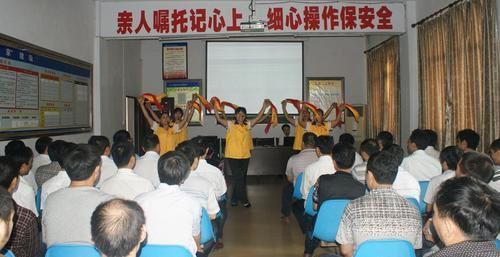 图为7月11日,在川煤集团达竹公司斌郎煤矿职工班前会议室,女工家属协管员们迈着欢快的舞步、说着精彩的快板,劝职工要牢记安全,干标准活,放心活,为自己,为家庭,为企业负责。