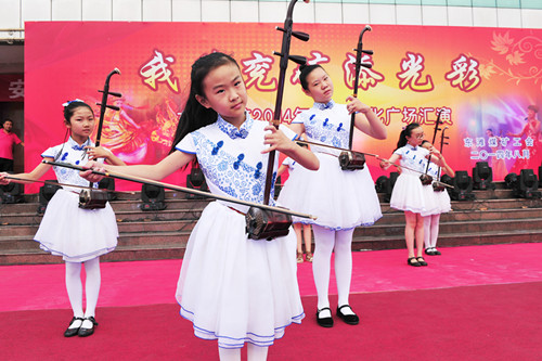 好戏连台。月下舞姿舞队在极具动感的音乐中舞出气势。9个女孩在不断变换的舞步中演奏二胡,让不少小观众连连叫好。靓姐交谊舞队妩媚服装和帅气搭配更显专业范十足。
