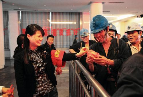 在中秋佳节来临之际,中煤集团大屯公司孔庄煤矿工会组织女工家属协管员开展迎国庆中秋,送爱心月饼慰问活动,把装有象征平安团圆的月饼有序地送到下井职工手里,并叮嘱他们当安全人、做安全事,牢记安全生产,把温馨的安全嘱咐和组织的温暖送到广大干部职工的心中,使他们感受到浓浓的亲情。图为该矿女工家属协管员正在为入井职工发放月饼。