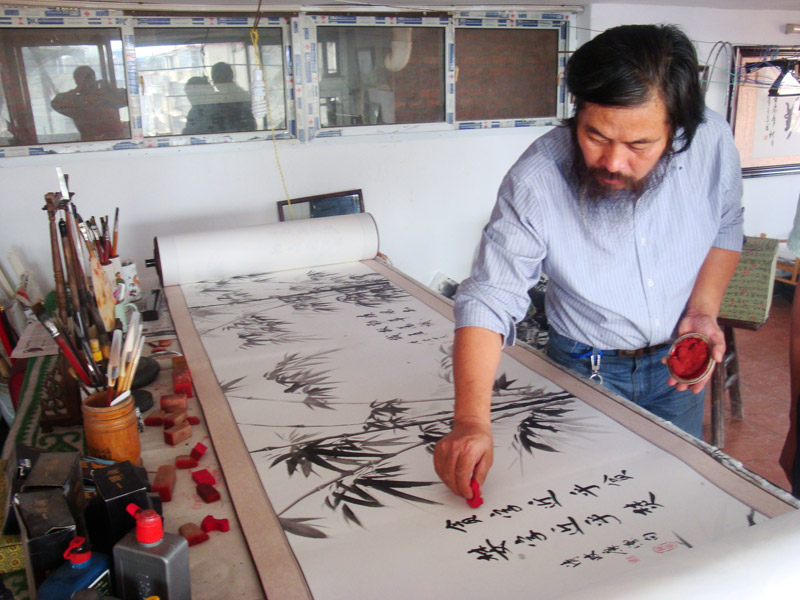 此画长100米,高0·8米,重达16公斤,其中美术部分62米,书法部分38米。这些数字正是对这幅作品最真实的描述。随着画卷的缓缓铺开,100幅形态各异的竹子构成了整个长卷气韵生动的骨架。整幅作品衔接流畅,构图完整,笔墨吻合,字画对接自然,珠联璧合。