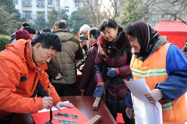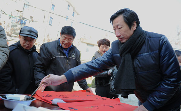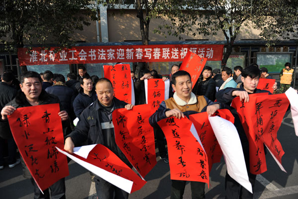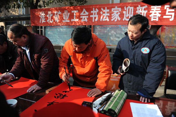 淮北矿业工会(文联)书法家写春联送祝福服务群众 来源:淮北矿业集团 作者:郭传火 时间:2015-02-13 【字体:小 大】 2月10日—12日,淮北矿业工会(文联)组织矿区书法家走入基层,深入到厂矿、社区,开展迎新春写春联送祝福活动。活动现场热闹非凡,矿区书法家们在人群的簇拥下挥毫泼墨,一些书法爱好者也积极参与,行书、楷书、草书、隶书各显其能,一幅幅苍劲有力、喜庆吉祥、寓意着美好愿望的春联及大大的福字,为广大职工群众送上羊年新春的第一份祝福。 智能标签: 淮北矿业集团 书法家 春联 相关内容 分享到: 【打印正文】