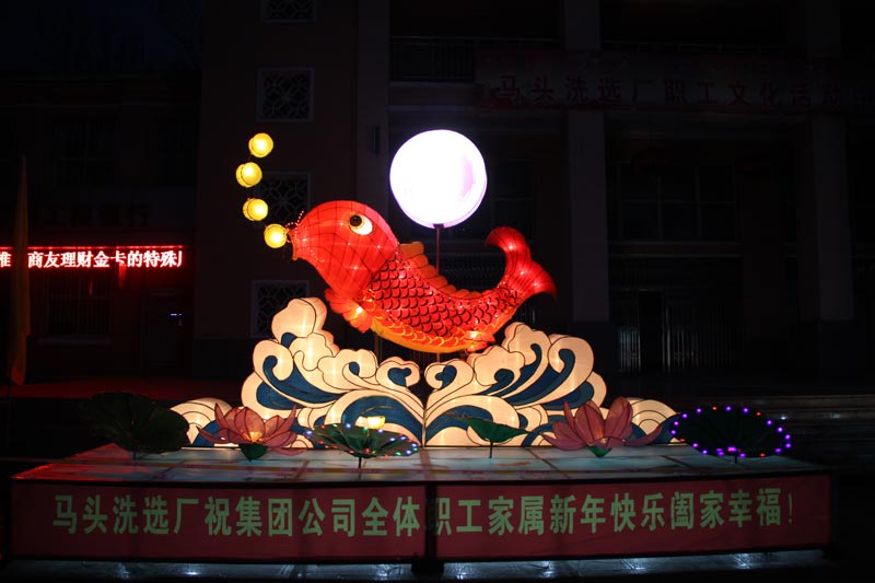 正月十五赏花灯,流光溢彩耀煤城。为职工春节期间营造文化气氛,3月2日,河北冀中能源峰峰集团马选厂在职工文化广场举办了“挺进之春”花灯展。由该厂机电科职工自行设计、安装的《二羊开泰》《年年有鱼》等大型组装花灯在五彩斑斓灯光映衬下,别具特色。两头喜羊羊对立上下鞠躬,中心悬挂着大红灯笼下写着二羊闹春的条幅格外醒目;《年年有鱼》花灯处,一条大鲤鱼晃动着尾巴从浪花中飞跃而出,寓意着企业来年各项工作踏浪前行。因其形态各异,造型突出,吸引着全厂职工家属及周边百姓纷纷走出家门,共享节日快乐。