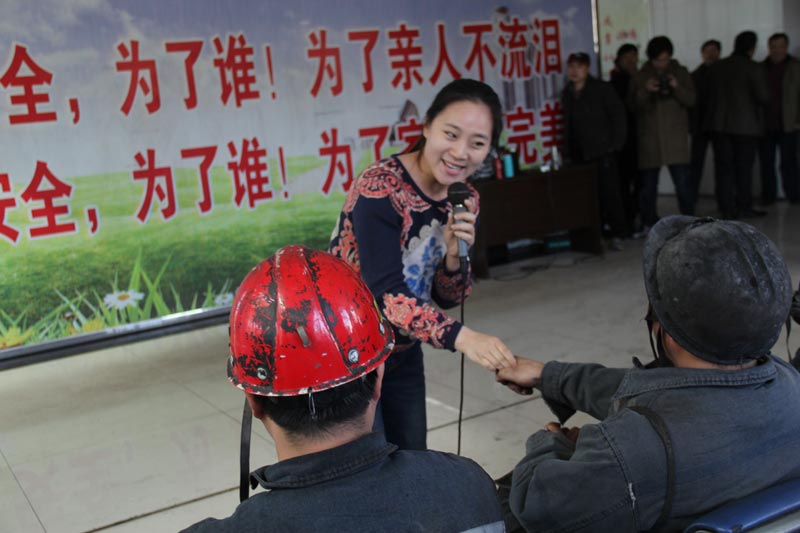 歌手高金秀在双欣煤业井口为刚上井的职工们演唱《节日欢歌》