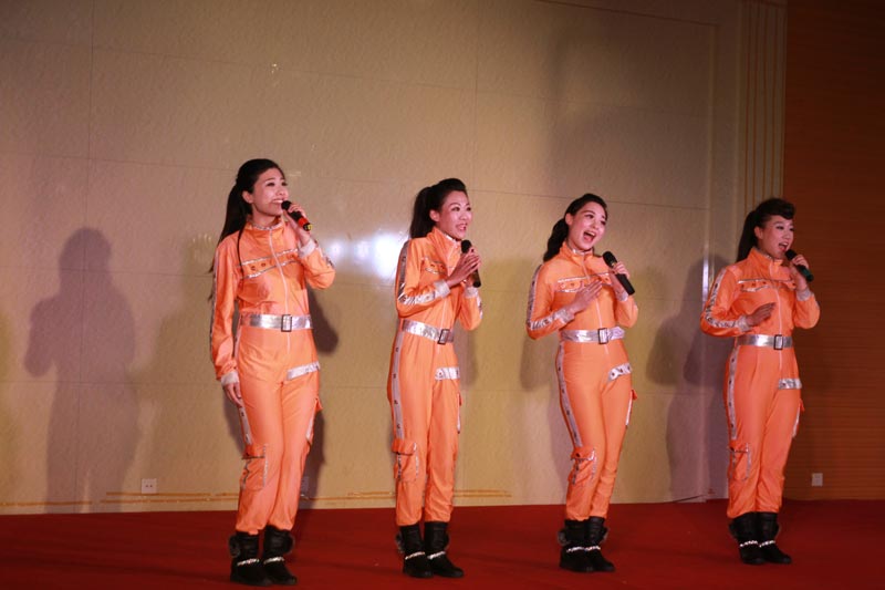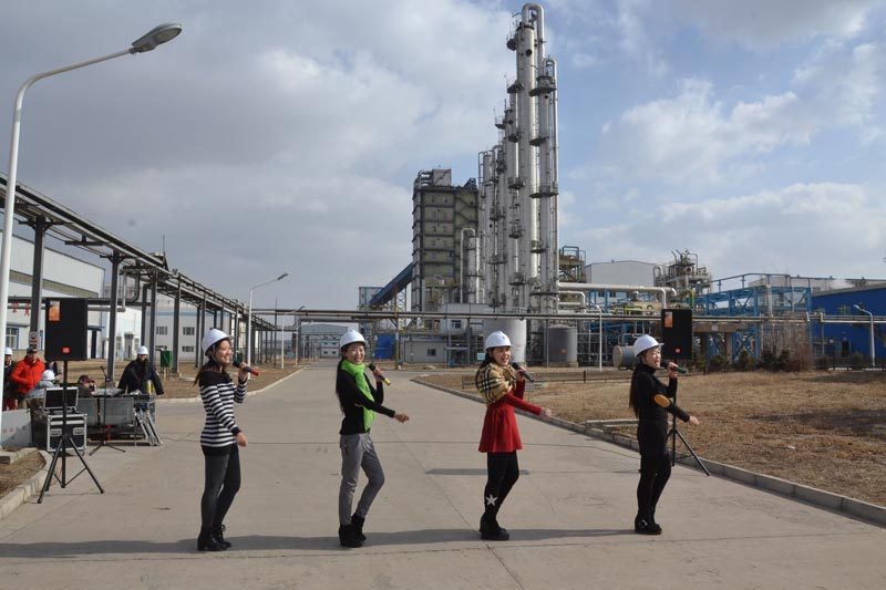 歌手张颖超 谭雅雯 谷文文 高明慧在世林化工厂区为员工演唱女声四重唱《女工走在矿区里》