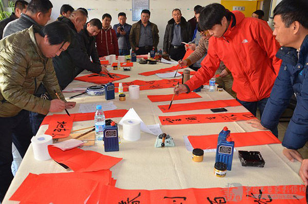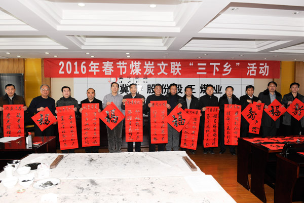 中国煤矿书法家协会积极响应中国书协关于2016年元旦春节期间开展“万名书法家送万‘福’进万家”公益活动的通知精神,认真组织煤炭系统各企业书法组织开展送万‘福’进万家活动。1月31日,由中国煤矿文联主办,中煤平朔集团公司承办的“走基层·送温暖”中国煤矿文联文艺志愿服务走进平朔活动在平朔矿区举行。活动现场气氛热烈,艺术家们挥毫泼墨,为平朔矿区职工写“福”字、写春联,边创作书画作品边和平朔矿区的书画爱好者交流创作经验,笔会交流活动共书写“福”字200多个,春联60多套,创作书法作品50多件、美术作品10多件。艺术家们用饱蘸喜气墨汁的画笔创作出一件件饱含诚意的书画作品,为平朔矿区职工红红火火的生活送上美好的祝愿。