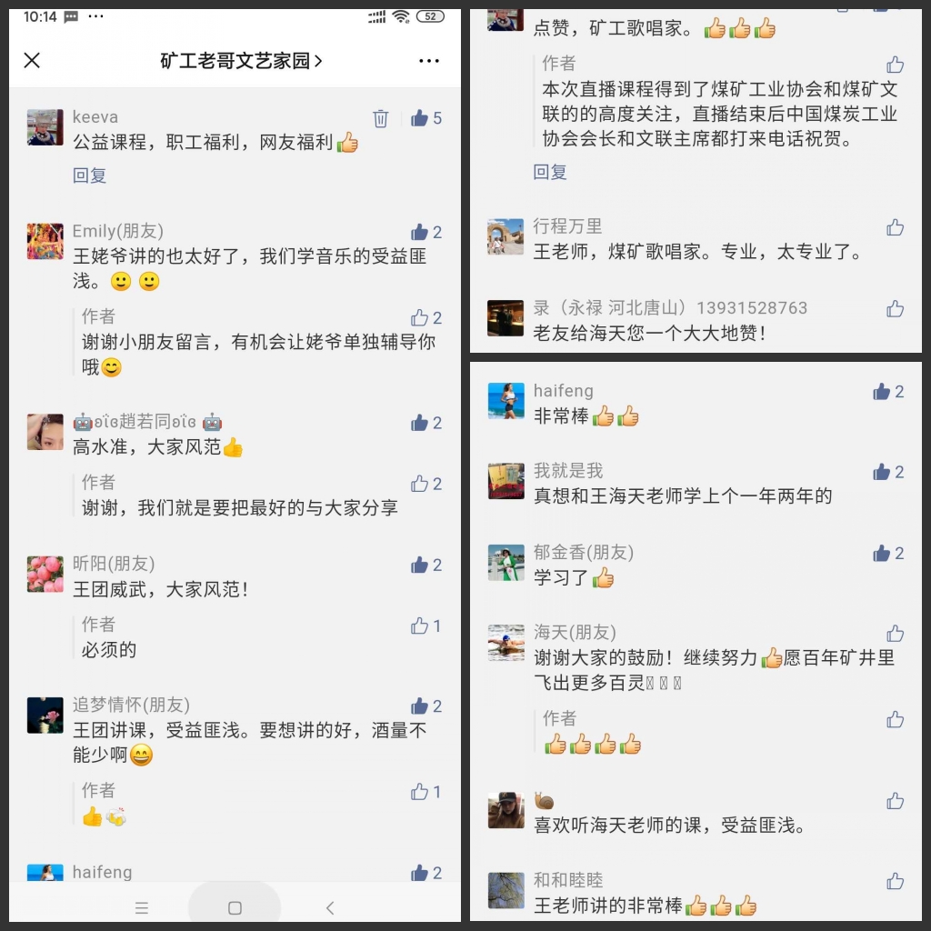 首期课程由中国煤矿音协主席、开滦艺术团顾问王海天主讲。在一个半小时的声乐教学直播课程中,王海天用深入浅出的讲解和精彩的现场示范、精准专业的答疑赢得了学员和网友们的热情点赞。网友纷纷刷屏: