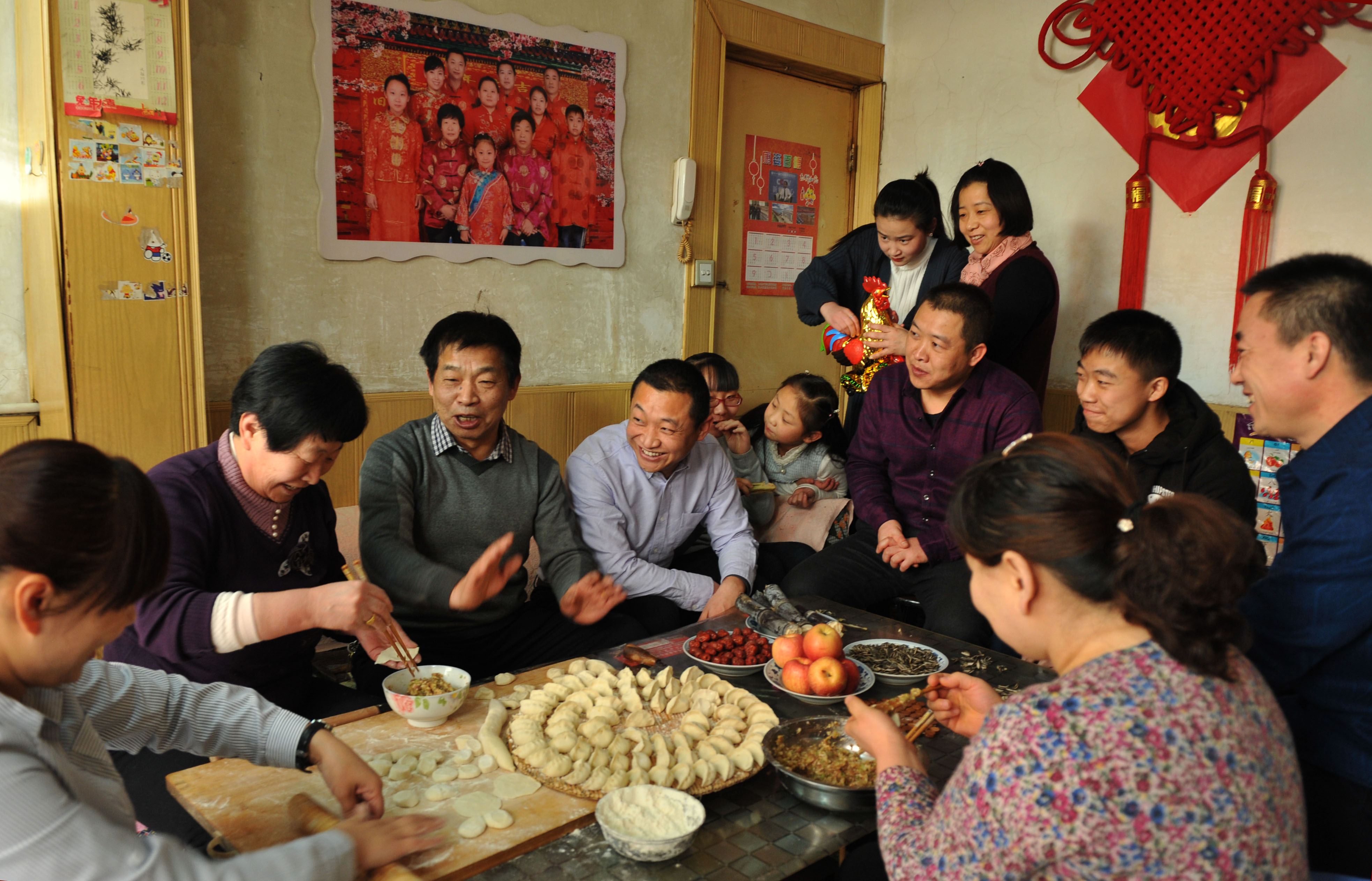 2017年的春节,山西潞安集团石圪节煤矿退休老工人杜金明(左三)一家正在家里高高兴兴地包着饺子。杜金明家里有3个子女都是分流安置职工,他们目前在新的岗位上工作顺利,一家人其乐融融,过了一个祥和快乐的春节。