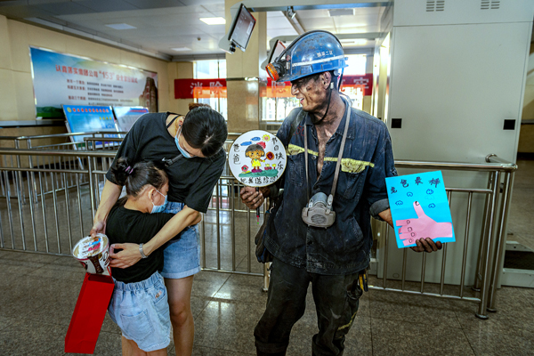 2020年6月21日父亲节,孩子把自己画的礼物,送给爸爸后腼腆的躲在妈妈的怀里。图片拍于东滩煤矿井口 。