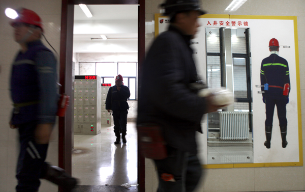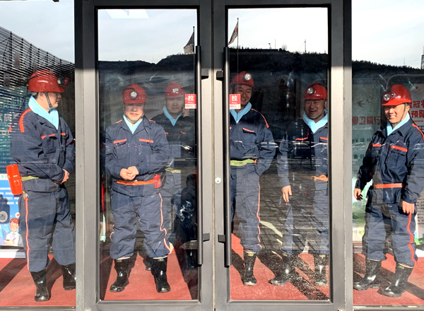 2018年11月,鄂尔多斯转龙湾煤矿,准备下井的工人从现代化的矿灯房装备好后,经过“入井安全警示镜”分赴岗位。