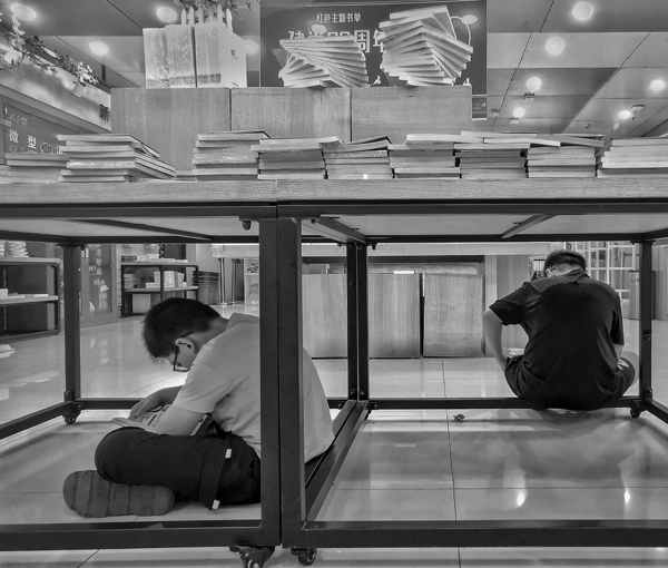 2020年6月27日淮北市新华书店。当日去书店购书时,看到两位少年蜷坐于书架下面,不顾坐姿的不适专注阅读,忘我的在“书海”中求知,在“阶梯”中进步,联想到了“书中自有颜如玉,书中自有黄金屋”的劝学古训,有感而记之。