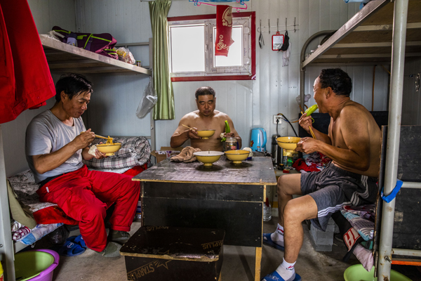 2019年7月21日正午时分在兖矿东华建设有限公司负责施工的"内蒙荣信乙二醇厂"工地,劳作了一上午的农民工兄弟回到宿舍吃午饭。我走进农民工兄弟居住的彩板房,被农民工兄弟"战酷暑、保工期"的精神和乐观情怀所感动,抓拍了他们吃饭的生活瞬间。