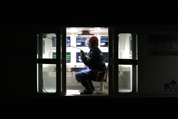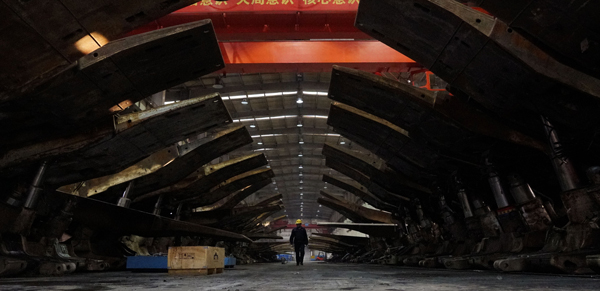 上湾煤矿8.8米大采高工作面是世界上第一个8.8米超大采高智能综采工作面,生产布局为一井一面,装备采用世界最先进的高阻力液压支架和大功率采煤机,生产系统采用远程自动化控制和安全监察监控系统自动化,是神东煤炭集团安全质量标准化样板矿井。2020年12月4日拍摄于神东煤炭集团上湾煤矿。