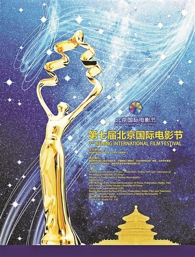 从现场公布的海报内容上看,以蓝色璀璨的星空为主体背景,海报中具体形象包含“天坛奖”奖杯,电影节的举办届数“7”,北京地标“天坛”。据介绍,海报主题为浩瀚星空下挥舞长袖的女神,寓意为“群星璀璨,天人合一”。由行星炫目轨迹组成的数字“7”代表了北京国际电影节的举办届数,轨迹上的点点星光代表在本届北影节上获得殊荣的优秀电影作品和演员。