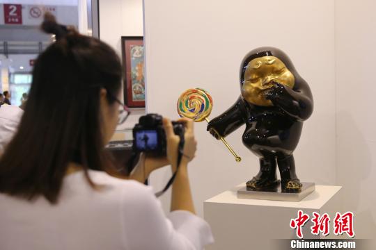 8月31日,第20届北京艺术博览会在中国国际展览中心开幕。图为展会现场,观众被展出的雕塑作品吸引并拍照。(完) 韩海丹 摄