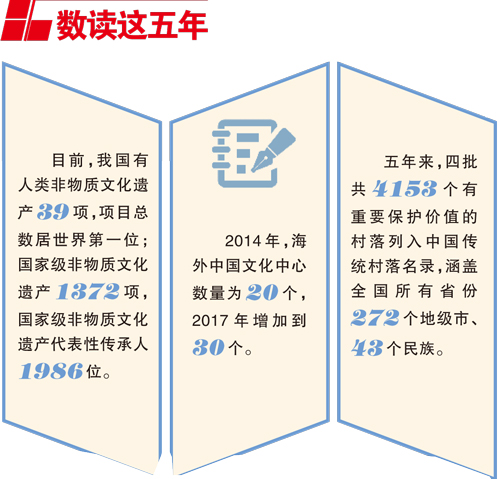 五年来,文化遗产价值更加深入人心。传统节日、自然和文化遗产日期间的文化遗产展示展演活动彰显魅力,成都国际非遗节、中国非遗博览会等展会广受关注,丝绸之路、花山岩画、珠算、二十四节气等项目申报世界遗产和人类非物质文化遗产名录连获成功,全社会保护文化遗产的自觉意识全面提升。