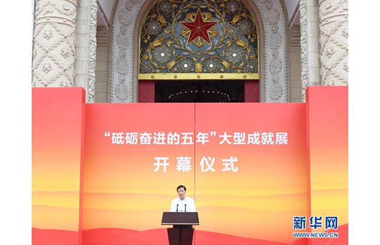 9月25日,“砥砺奋进的五年”大型成就展开幕式在北京展览馆举行。中共中央政治局常委、中央书记处书记刘云山发表讲话并宣布展览开幕 (新华社记者 张铎/摄)