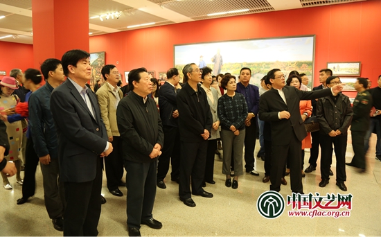 中共十八届中央委员、十二届全国政协副主席马飚,十一届全国政协副主席、中国文联名誉主席孙家正,中国文联主席铁凝,中国文联党组书记、副主席李屹,中国文联党组成员、副主席赵实,中国文联党组成员、副主席左中一,中国文联党组成员、副主席郭运德,文化部副部长董伟,中国侨联党组成员、副主席乔卫,中国国家博物馆馆长吕章申,中国文联党组成员、书记处书记陈建文,中国人民革命军事博物馆馆长董长军,中共中央宣传部文艺局局长汤恒,中共中央宣传部宣教局局长常勃,中国美协主席刘大为,中国文联副主席、中国美协副主席,中国美术学院院长许江,中央军委政治工作部宣传局副局长徐黄生等领导出席开幕仪式。