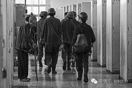 10/20 1991年,山东兖矿集团南屯煤矿,升井后的矿工走入浴室更衣洗澡。