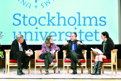 12月9日,2012年诺贝尔文学奖得主、中国作家莫言(右二)在瑞典首都斯德哥尔摩的斯德哥尔摩大学举行文学讲座。