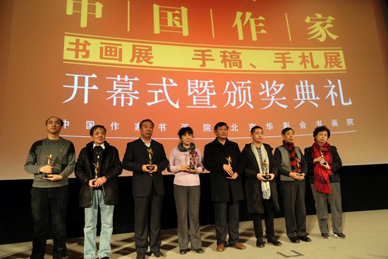 首届中国作家书画展展出的300余件书画作品从两千余件来稿中遴选而出,其中12位作者分别荣获优秀书法作品奖和优秀美术作品奖。手稿、手札由组委会向部分著名作家、学者特约,具有原创性和艺术性。