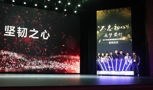 1月23日,国家新闻出版广电总局和中国作家协会在北京联合发布2017年优秀网络文学原创作品推介名单,《复兴之路》《岐黄》《草根石布衣》《全职妈妈向前冲》《诡局》《恩将求抱》《别怕我真心》《如果深海忘记了》《糖婚》《秋江梦忆》《心照日月》《交换吧,运气!》《夜旅人》《武林大爆炸》《完美世界》《雪鹰领主》《择天记》《原始战记》《君九龄》《万古仙穹》《华簪录》《朱颜•镜》《天域苍穹》《太玄战记》等24部作品入选。