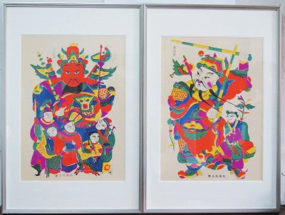被称为天下第一门神的秦琼和尉迟恭,来源于一个传说。相传唐太宗李世民登基后,常觉寝宫有异样声响,后大将秦琼、尉迟恭全副戎装,把守宫门,结果平安无事。李世民觉得两位大将太辛苦了,遂命画工将他俩的威武形象绘于宫门上,称为“门神”。于是“门神”木版年画广传民间,新年贴于门上,驱邪卫家宅,祈福保平安。以后又逐渐把捉鬼的钟馗、忠义的关羽和“铁面”包拯也列于其中。五子门神,则来源于窦燕山教子故事。据《宋史·窦仪传》记载:“仪学问优博,风度峻整。弟俨、侃、偁、僖,皆相继登科,当时号为窦氏五龙。”除夕之时张贴五子门神,既是对家庭人丁兴旺的祈求,也是对子辈前程似锦的祝愿。此外,“麒麟送子”“年年有鱼”“天官赐福”“富贵满堂”“四季花开”“一团和气”等以及《三国演义》《水浒传》《封神演义》等名著人物故事等也都深受百姓喜欢。