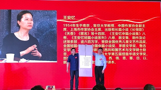 《小说选刊》杂志社副主编李晓东为王安忆赠送王卫军先生书写的奖授词书法作品,《小说选刊》编辑部主任顾建平代为接受
