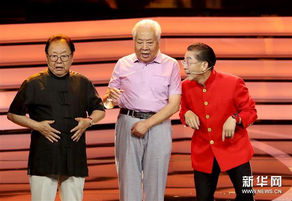 6月12日,演员六小龄童(右)、马德华(左)和朱龙广在盛典现场重现电视剧《西游记》中的经典片断