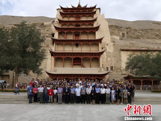 8月19日至20日,“2018年敦煌论坛:敦煌与东西方文化的交融国际学术研讨会”在敦煌莫高窟召开。图为与会嘉宾在莫高窟前合影留念。敦煌研究院供图