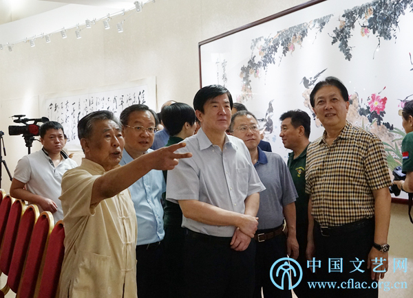 9月1日,“不忘初心·礼赞丝路——庆祝改革开放40周年艺术家书画作品巡展”在北京开幕。图为中国文联党组书记、副主席李屹,中国文联党组成员、书记处书记陈建文等参观展览。