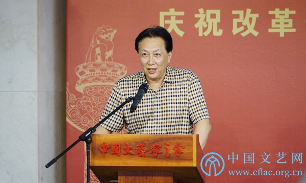 9月1日,“不忘初心·礼赞丝路——庆祝改革开放40周年艺术家书画作品巡展”在北京开幕。图为参展艺术家、中国视协顾问唐国强致辞。