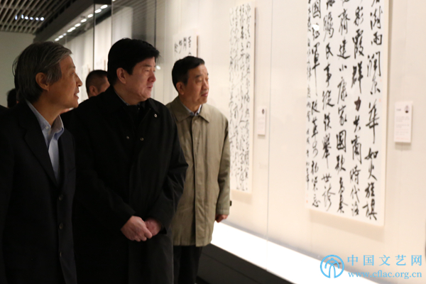 11月7日,由中国文学艺术界联合会、中国书法家协会、国家典籍博物馆主办的“书写新时代——全国新文艺群体书法作品汇报展”在国家典籍博物馆开幕。图为中国文联党组书记、副主席李屹,中国书协主席苏士澍,中国书协分党组书记、驻会副主席陈洪武等参观展览。(中国文艺网/张钰童/摄)
