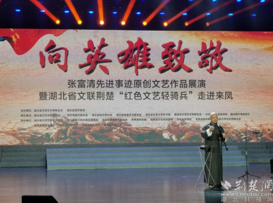 “向英雄致敬——张富清先进事迹原创文艺作品展演暨湖北省文联荆楚‘红色文艺轻骑兵’走进来凤活动”近日在湖北来凤上演,歌曲《坚守》《永远的本色》《我想你了》《老兵的本色》《英雄无言》《爷爷的军功章》《英雄本色》,湖北大鼓《锁药记》,有关张富清的画像和书法作品等一批以“张富清同志先进事迹”为主题创作的原创文艺作品首次集中呈现在观众面前。这些作品是湖北省文联根据“不忘初心,牢记使命”主题教育安排,积极谋划、精心组织全省文艺家进行创作所取得的阶段性成果展示。