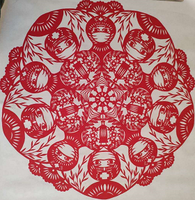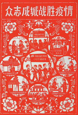 2020年春节,我国爆 发新型冠状病毒肺炎疫情,以习近平同志为核心的党中央发出号召,全国人民万众一心,抗击疫情。医疗战线紧急驰援疫情重灾区,其他行业如何动作呢?南京大学 文化与自然遗产研究所做出了示范,他们在做好自身防护的同时,发动全国民间剪纸非遗传承人拿起手中的剪刀献大爱,以剪驰援,以传统的民族民间文化为武器, 运用中国非遗剪纸的语言、符号、寓意等元素创作出一批精品力作,向奋战在疫情一线的勇士们表达问候,给疫情严重的地区加油鼓劲。