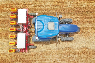 在河南省邓州市小杨营镇安众村,加装有北斗导航系统的拖拉机在无人驾驶状态下播种。新华社记者 冯大鹏摄