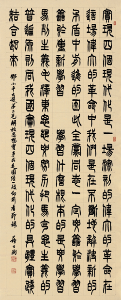习近平总书记强调:“一切伟大成就都是接续奋斗的结果,一切伟大事业都需要在继往开来中推进。”衷心希望广大书法工作者以这次展览为契机,进一步深入学习贯彻习近平新时代中国特色社会主义思想,特别是习近平总书记关于文艺工作的重要论述,胸怀两个大局,心系国之大者,增强文化自信,自觉承担起举旗帜、聚民心、育新人、兴文化、展形象的使命任务,真正做到胸中有大义、心里有人民、肩头有责任、笔下有乾坤。衷心希望广大书法工作者认真参与“四史”特别是党史学习教育,固本培元、砥砺品格,真正做到学史明理、学史增信、学史崇德、学史力行,用心用情用功传承红色文化基因、书写伟大时代华章,为建设社会主义文化强国、全面建设社会主义现代化国家贡献力量!