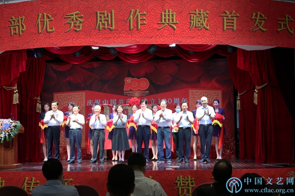 6月22日,庆祝中国共产党成立100周年《百部优秀剧作典藏》首发仪式在京举办。图为领导嘉宾共同为《百部优秀剧作典藏》新书首发剪彩。中国文艺网 马征 摄。