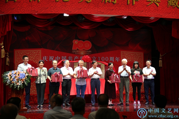 6月22日,庆祝中国共产党成立100周年《百部优秀剧作典藏》首发仪式在京举办。图为赠书仪式。中国文艺网 马征 摄。