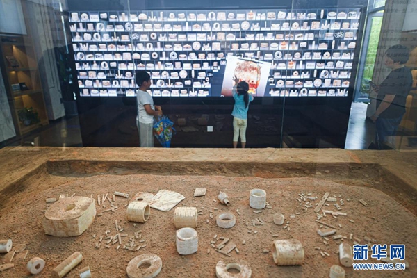 2020年6月6日,小游客在浙江省杭州市余杭区瓶窑老街的“良渚玉雕馆”内通过电子屏学习玉雕知识。新华社记者 徐昱 摄