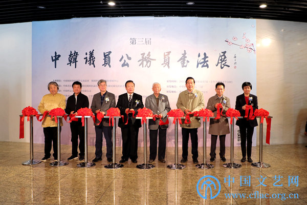 11月2日,第三届中韩议员公务员书法展在京开幕。图为与会领导嘉宾为展览开幕式剪彩。 中国文艺网 韩雪竹 摄
