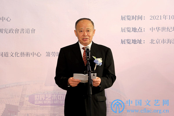 11月2日,第三届中韩议员公务员书法展在京开幕。图为中国城乡发展国际交流协会监事冯卓志在开幕式上致辞。 中国文艺网 韩雪竹 摄