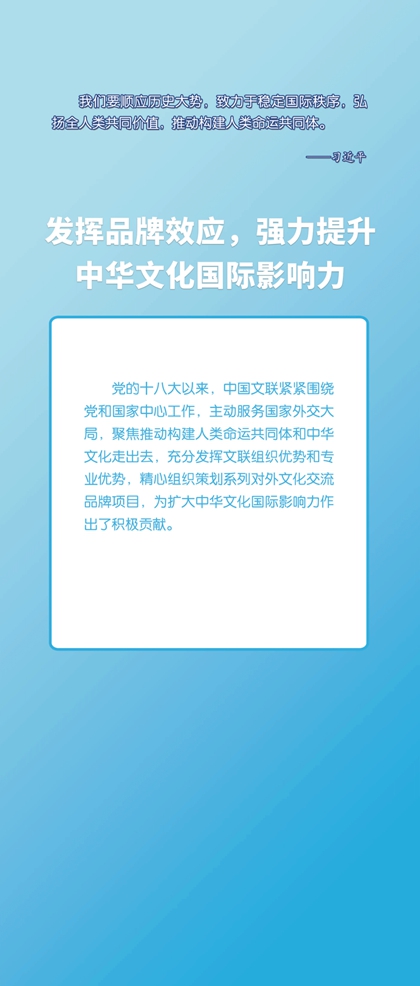 党的十八大以来,在习近平新时代中国特色社会主义思想指引下,中国文联坚定不移贯彻中央决策部署,围绕中心、服务大局,遵循党的外交方针和布局,以习近平总书记关于构建人类命运共同体、建设“一带一路”、讲好中国故事、推动世界文明交流互鉴等重要思想为引领,发挥组织优势和专业优势,坚持“请进来”与“走出去”相结合,组织开展深层次、多领域的人文交流和主题鲜明、内容丰富、形式多样的文艺展演活动,努力推动中华文化走出去,扩大中华文化的国际影响力。同时,中国文联坚决贯彻中央对港澳和对台工作方针,聚焦“做人的工作”,发挥引领作用,广泛团结港澳台文艺组织、团体和文艺家,在共同弘扬和繁荣中华文化的过程中增进民族情感和文化认同,为筑牢中华民族命运共同体作出了应有的贡献。