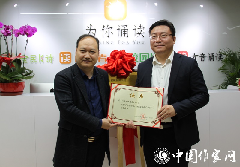 11月8日,中国作家协会全民阅读推广办公室授权北京诵读文化发展有限公司为“全民阅读推广单位”,授牌仪式在北京举行。这是中国作家协会全民阅读推广办公室授权的全国首家“全民阅读推广单位”。中国作家协会社会联络部主任李晓东、公共文学服务处处长刘戈、“为你诵读”App创始人项建新等参加仪式。