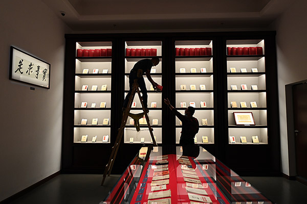 9月28日,中央总馆“真理之光”展区,工作人员在调整展陈。